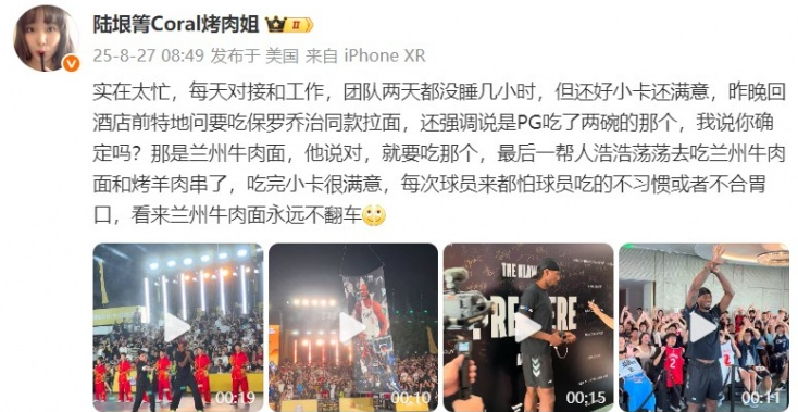 小卡中国行不仅体验中国功夫,而且品尝中国美食,据媒体人烤肉姐陆垠箐透露,他在社媒上写道:实在太忙,每天对接和工作,团队两天都没睡几小时,但还好小卡还满意,昨晚回酒店前特地问要吃保罗乔治同款拉面,还强调说是PG吃了两碗的那个,我说你确定吗?那是兰州牛肉面,他说对,就要吃那个,最后一帮人浩浩荡荡去吃兰州牛肉面和烤羊肉串了,吃完小卡很满意,每次球员来都怕球员吃的不习惯或者不合胃口,看来兰州牛肉面永远不翻车。